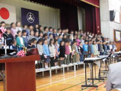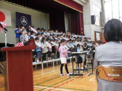 入学式が終わると、お待ちかねの2年生による歓迎のアトラクションです。2年生は呼びかけ、「にじ」の合唱、「よろこびのうた」の合奏を披露しました。2年生のお友達は、3月には朝練習もしていました。とてもすばらしかったです。1年間の大きな成長を感じました。学校で一番小さなお兄さん、お姉さんですが、とても優しく頼りになる存在です。仲良くしましょう。
