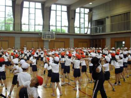 今日は、体育朝会で「玉堤体操」を全校児童で行いました。1年生は、初めてでしたが、それまでに学年で練習していたこともあり、良くできました。運動会で開会式の後に行います。全員で怪我のないように玉堤体操を行い、楽しい運動会にします。