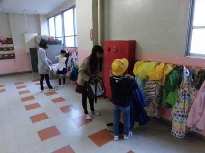 学校生活の2日目は、雨の中の登校となりました。かさやランドセルカバー、コートなど片づけなければならないものも多く大変です。しかし、玄関にも教室にも6年生や先生方が1年生を待っていて手助けしました。1年生のお友達は、混乱することなく朝の準備を済ませることができました。