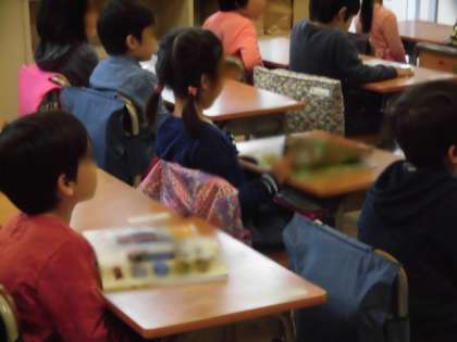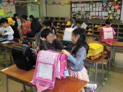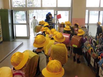 教科書で学習した後、すぐに下校の準備を済ませました。雨が降っていなければ、校庭に並ぶのですが、雨なので玄関にコースの色別に並びました。集団下校の準備です。狭い場所ですが1年生は上手に並ぶことができました。
