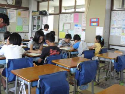 4年生は、少人数指導の下、「小数の割り算」の学習を行いました。商が1の時の学習を思い出し、商が2の割り算の筆算を学習しました。合言葉は「たてる、かける、ひく、そして、おろす」と計算の順を言葉に置き換えて、一人一人ができるようになりました。また、友達同士の教え合いもあり、互いに伸びようとする姿も見られました。