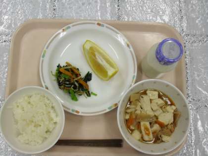 今日のメニューは、ご飯、豆腐とエビのうま煮、磯辺あえ、夏ミカン、牛乳」でした。夏を思わせる日になりました。たくさん食べて、暑さに負けないようにしたいです。