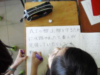 6年生は社会科の学習で「武士の世の中」について学習しました。「武士の世の中は、どのような様子だったのだろうか」という課題で一人一人が、提示された絵を基に問題を考え、グループで話し合いました。「屋敷をお堀で囲み、貴族の屋敷と違う」「牛や馬を使って農業をしている。蹴鞠をして遊んでいた貴族と違う」など、これまで学習したことを基にして、問題を考え、話し合いまとめていました。
