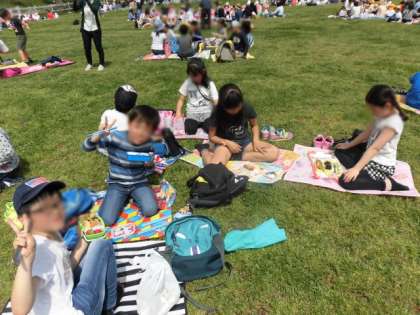 芝生広場の上でグループごとに集まってお弁当タイムです。