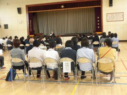 まずは、体育館で全体会を行い、各校の先生方を紹介した後、野口校長先生から今年度の取り組みの計画についてお話しいただきました。