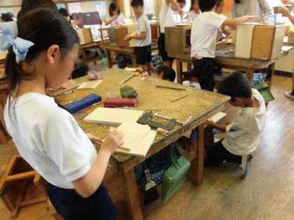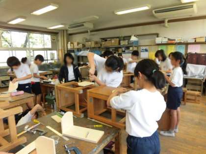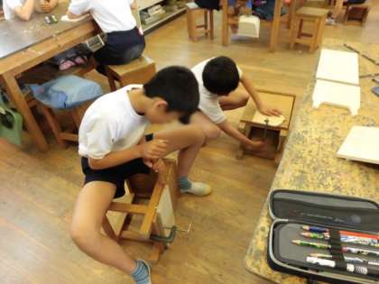 その過程でクランプ、金定規、ドライバー、電のこ、きりなどさまざまな道具を使います。けがに注意しつつ、自分の作りたいものを考えて、適切に道具を使いこなせるようになることも大切な学習です。制作は個人作業ですが、友だち同士作品を見合い、相談しながら、とても集中して取り組んでいます。できあがりがたのしみです。