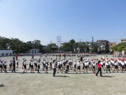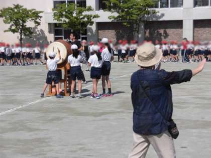 運動会で踊る玉堤音頭の練習をしました。玉堤町会のみどり会の皆さんが先生です。トラックの中心でお手本を示してくださいました。玉堤音頭は、昭和56年の20周年記念運動会で初めて踊られたそうです。