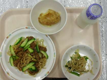 5月もいよいよ最後になりました。今日のメニューは「ジャージャー麺、もやしのごま風味、じゃがバター、牛乳」でいた。暑い1日でした。運動会に備えて、たくさん食べて元気一杯です。