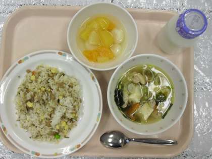 今日のメニューは「じゃこチャーハン、わかめスープ、フルーツ白玉、牛乳」でした。じゃこチャーハンは、とてもいい味でした。運動会も元気一杯に取り組みます。