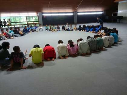 午後のはじめは村の会堂を使って室内レクです。ハンカチ落とし、インベーダーゲーム?氷おになどレク担当の計画でみんなで楽しく遊びます。