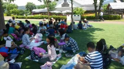 村めぐりを終えて、田園プラザに到着しました。川場移動教室最後の食事を広場でいただきました。