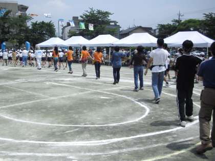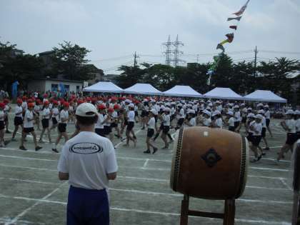 子どもたちの頑張りに天気も良くなり、午後の部が開始されました。5・6年生の鼓笛ドリルからスタートです。みどり会、玉堤太鼓保存会の皆様の支援で行われた、玉堤音頭と行いました。