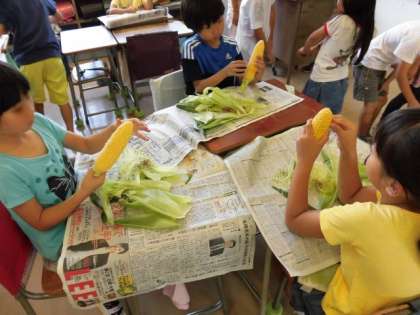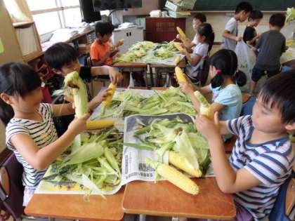 今日のとうもろこしは、2年生に皮むきのお手伝いをしてもらいました。