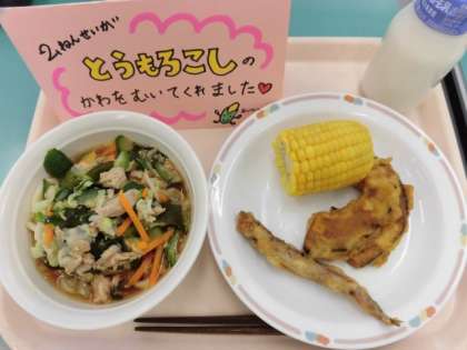 教室で一人2本くらいずつ上手にむいてくれました。ひげまでとても丁寧にむいてくれた子、とうもろこしの皮の片づけを最後までしてくれた子、給食室までむいたとうもろこしを届けてくれた子、進んで色々な手伝いをしてくれました。