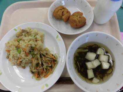 今日は沖縄県の郷土料理でした。「シシジューシー」豚肉のまぜごはん、「マーミナチャンプルー」はもやしを使った野菜炒めです。