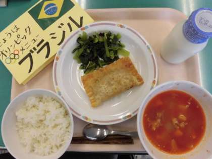 今日の給食では、ブラジル料理の「パステウ」「コーギー」「フェイジョアーダ」がでました。「パステル」は中に様々な具をいれ、ぎょうざのような皮で包み油で揚げます。コーギーはケールを使った炒めものですが、給食では小松菜を使いました。フェイジョアーダは肉と豆の煮ものです。給食風に少しアレンジしてだしました。
