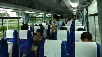 外は少し雨模様ですが、バスの中は早くも盛り上がっています。バスレク係さんたちがいろいろなゲームを用意して、みんなで楽しんでいます。みんなの協力体制が素晴らしいです。