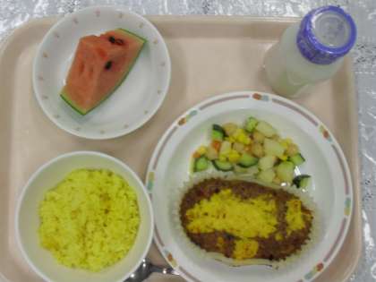 今日のメニューは、イエローライス、ボボティー(南アフリカ風ミートローフ)豆と野菜のサラダ、スイカ、牛乳」でした。今日は、給食のお知らせを各教室に配りました。お知らせで、公開します。