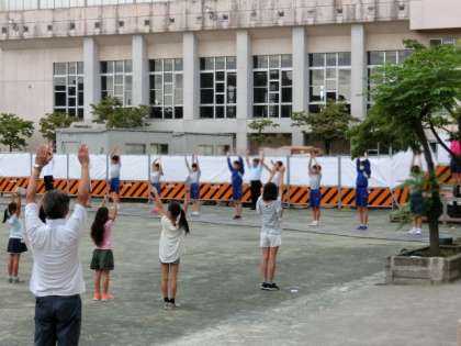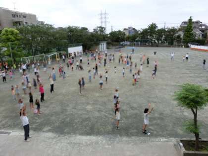 学校運営委員会主催のラジオ体操が始まりました。29日(金)までで、毎日7時から校庭で行います。今年は、尾山台中学校の先輩たちも、ボランティアとして参加して皆さんの前で体操します。