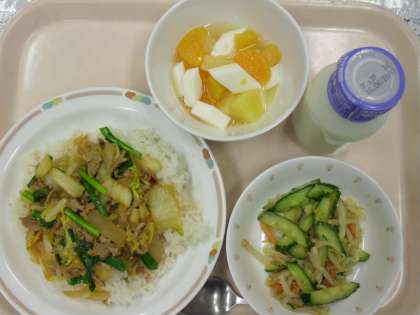 今日のメニューは「豚キムチ丼、もやしのごま酢あえ、杏仁豆腐、牛乳」でした。ちょっと辛めの豚キムチ丼、暑さに向けていいメニューでした。