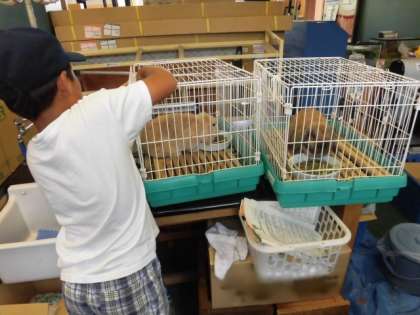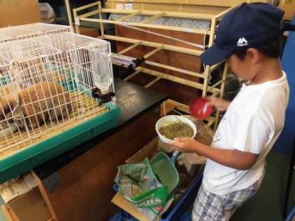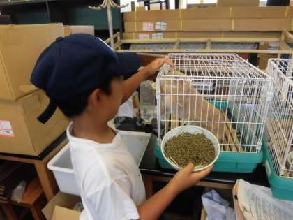飼育栽培委員会のお友達は、夏休みも2羽のウサギのお世話に当番で取り組んでいます。ウサギたちは、当番のお友達が準備を始めると、ケージに足をかけ催促しています。