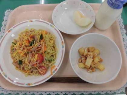 今日は筍の果物、なしがでました。水分たっぷりの豊水だったので暑い日の水分補給にぴったりでした。