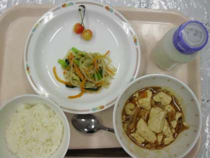今日のメニューは「ご飯、四川豆腐、塩ナムル、サクランボ、牛乳」でした。今日は、中華料理のメニューです。少し辛さがあり、暑さに丁度いいメニューでした。