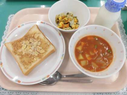 今日のアーモンドトーストはマーモンドパウダーとグラニュー糖、バターを混ぜたものをパンにぬり、アーモンドスライスをのせて焼いて作りました。アーモンドの香りがたっぷりのトーストでした。
