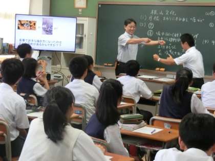 翠と溪の学び舎の三校(尾山台中学校・尾山台小学校・玉堤小学校)の先生方で研修会を行いました。今回は、中学校の先生と小学校の先生がチームを組んで授業を行いました。玉堤の3人の先生方も授業に加わり、中学校の学習のつながりを意識し、先生方各自の役割をはっきりさせて授業に臨みました。