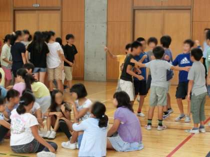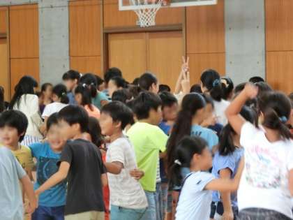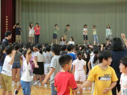 校庭で違うゲームをする予定でしたが、雨が降ってしまったので体育館で「もうじゅがりに いこうよ」をしました。「マウンテンゴリラ!!」 歌の後に出てくる動物の名前の文字数に合わせた人数のグループを作って楽しみました。文字数が多くなるとグループ作りが難しくなりますので、お友達同士声をかけ合ってグループを作っていました。違う学年のお友達が集まったグループもたくさんできました。