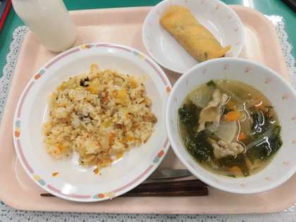 キムチチャーハンは人気の献立の1つです。キムチが入っているため、少しピリピリと辛く、「少し辛い」という児童もみられましたが、よく食べていました。