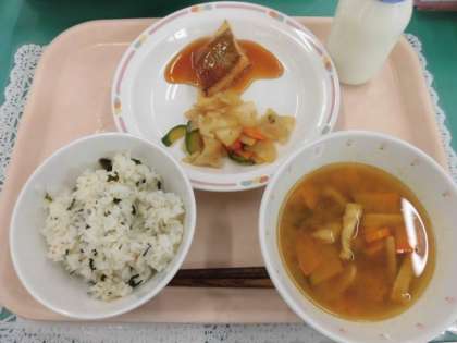 今日のカレイは柔らかかったので子どもたちも食べやすかったようです。お当番さんもいつもより崩れやすく難しそうでしたが、上手に配缶していました。