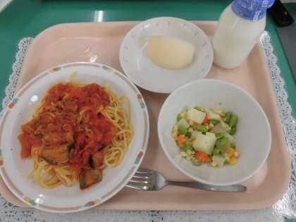 今日は今が旬の食材「なす」を使ったスパゲティでした。調理師さんが玉ねぎを炒め、トマトソースをよく煮込んでくれたのでこくのあるトマトソースができあがりました。