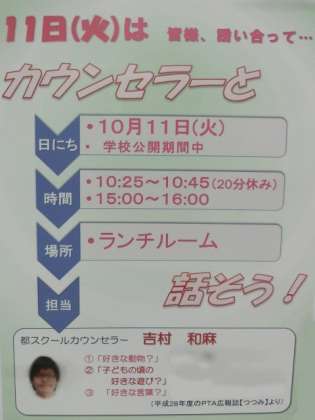 明日11日(火)は、2学期の学校公開最終日です。教科「日本語」の授業を各学級で行います。また、10:25〜10:45(20分休み)と放課後15:30〜16:00にランチルームで「カウンセラーと話そう!」を行います。先日のカウンセラーのおたよりや学校公開のお知らせでもご案内しましたように、スクールカウンセラーと気軽に歓談していただく場を設けます。自由に参加していただけます。担当は、都スクールカウンセラーの吉村です。ぜひ、足をお運びいただきたいと思います。よろしくお願いします。