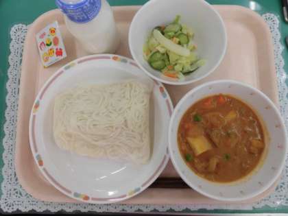 今週は玉堤小学校55周年おめでとう週間です。今日は玉堤小学校が20才だった、昭和40年代のころの給食を出しました。このころの人気メニューはソフトめんでした。今日はソフトめんを自分で出してカレーシチューにつけて食べます。低学年の児童は食べなれたないせいか、めんがくっついているのにとまどっている様子でしたが、楽しそうに食べていました。