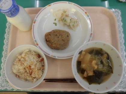 今日は3年生のふれあい給食でした。おじいさんおばあさんを招待してとても楽しそうに会食をしていました。今日の給食では孫とかけて「まごわやさしい」給食でした。「まごわやさしい」は食材の頭文字で、「ま」は豆、「ご」はごま、「わ」はわかめ、「や」は野菜、「し」は椎茸、「い」はいものことをいいます。全部そろえて食べるととても体にいいので、毎日食べるようにしてほしい食材です。今日はこの「まごわやさしい」の食材が全部入ってる給食メニューにしました。