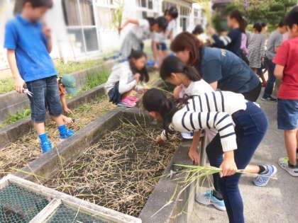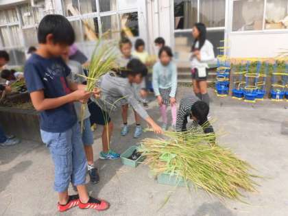 5年生が育てている稲の穂が重たく垂れるようになりました。晴天が続いているので急遽稲刈りをすることになりました。刈り取った稲は束にして教室前に干しました。