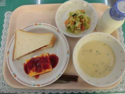 今日はブルーベリージャムとストロベリージャムが入ったベリーベリーサンドでした。うすい食パンに2種類のジャムを塗り、3枚の食パンをサンドしたジャムサンドでした。そのためいつもより大きな口をあけて食べていました。