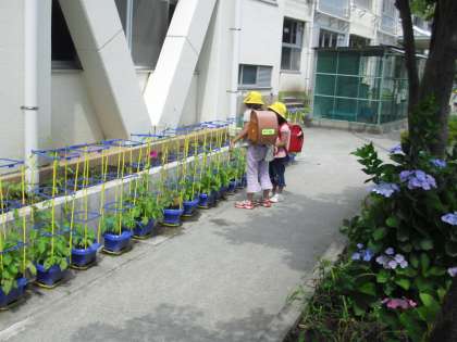 1年生が育てている「朝顔」大きくなり、花を咲かせました。1年生が一生懸命に世話をした成果です。また、他の学年の植物も大きくなり、トウモロコシやトマトはいくつも身を付けています。