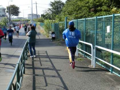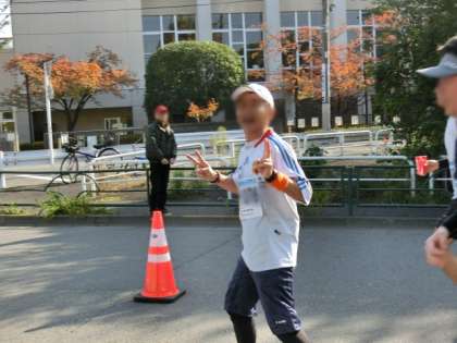 今年も、玉堤の学校運営委員の岩崎さんが急坂を登っていきました。そして、尾山台中学校の野口校長先生(赤と黒のランナー)も通過していきました。
