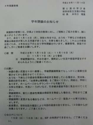 4年生は、本日、感染性胃腸炎様症状による児童の欠席が多くなりました。そこで、明日11月15日(火)・16日(水)の2日間を学年閉鎖とします。登校は11月17日(木)からです。