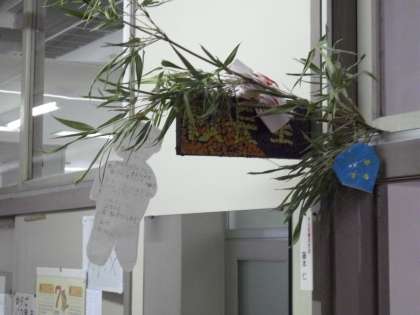 七夕の今日、2年生の子どもが「七夕の笹飾り」をプレゼントしてくれました。校長室の入口に飾りました。