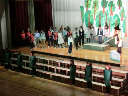 最高学年としての学芸会。学芸会当日を迎えるまで一人ひとりの台詞はもちろん、立ち位置や台詞のないときの演技、表情まで意識して練習を重ねてきました。照明や音楽、背景の出し入れ、幕の開け閉めを子ども達が分担して担当し、自分の役割をしっかり果たしました。6年生みんなで心と力を合わせて素晴らしい「人間になりたがった猫」を創り上げることができました。大きな拍手をいただきまして、ありがとうございました。(6年担任)