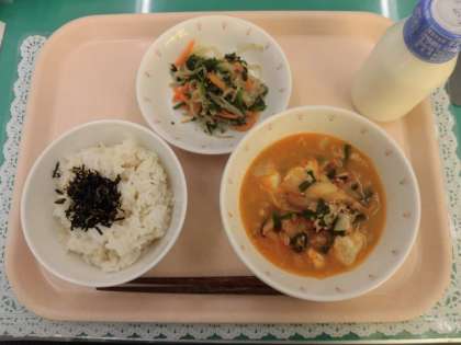 チゲとは韓国語で鍋料理の意味を持ちます。今日は豆腐をメインにキムチ、あさり、しいたけなどをいれた豆腐チゲをだしました。キムチは食べなれている児童も多く、汁まで必死におかわりしている姿も見られました。