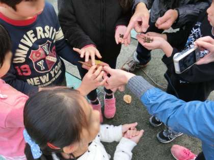 今、2年生は国語科の「たねのたび」で、様々な種の飛び方について、学習をしています。それに併せて、城南環境学習支援グループの方々に、実や種のお話をしていただきました。お話を聞いた後に、実際に学校にある植物の実や種を探しました。子どもたちは、実や種を集めたり、触ったり、匂いを嗅いだりして楽しんで学習しました。積極的に、実や種について質問していました。普段何気なく過ごしている校庭にたくさんの実や種があることに気付き、驚いた様子でした。短い時間ではありますが、実や種が広がっていく様子を感じることができました。(2年生担任)