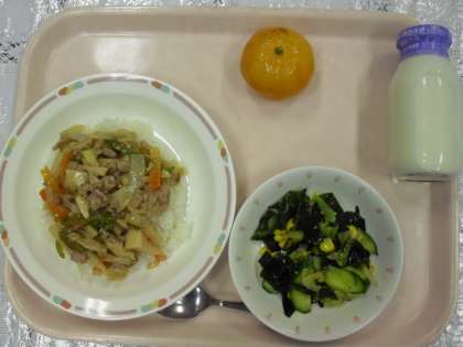 今日のメニューは「チンジャロース丼、ワカメサラダ、冷凍ミカン、牛乳」でした。