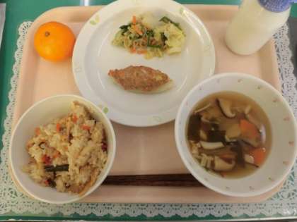 今日の木の葉焼きは笹かまぼこにひき肉をのせオーブンで焼き、葉っぱに見立てて作った料理です。きのこ汁には今が旬のきのこがたっぷり入り、秋満載の給食メニューでした。