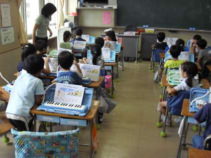 夏休みを目前に、1年生は「鍵盤ハーモニカ」で、演奏をしていました。これまでに学習した曲をみんなで演奏したり、一人で演奏したりしていました。とても上手にできていました。