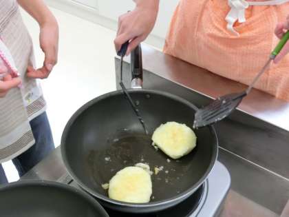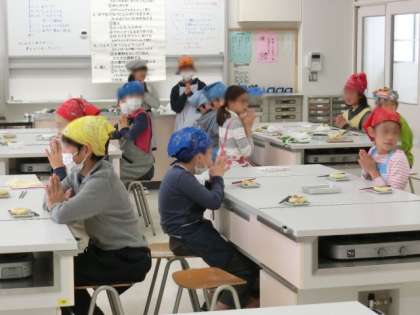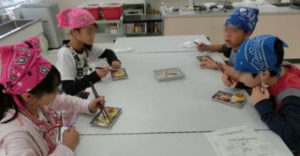 いよいよお待ちかねの「いただきます」。なかなかのできばえに、みんな満足げでした。担任の先生を家庭科室にお招きし、校長先生には校長室に届け、味わっていただきました。お返事は、当然Verry good!!