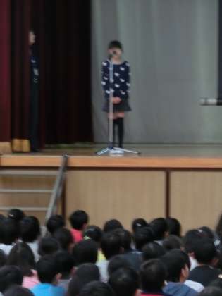 11月に世田谷区の海外派遣でオーストリアに行った5年生のお友達が写真を見せながら報告をしました。オーストリアでは、オーストリアの子どもたちにドイツ語であいさつをしたり、日本の文化の1つとして折り紙の折り方を伝えたりしたそうです。世田谷区の代表、そして玉堤の代表としてとても立派に交流を行うことができました。